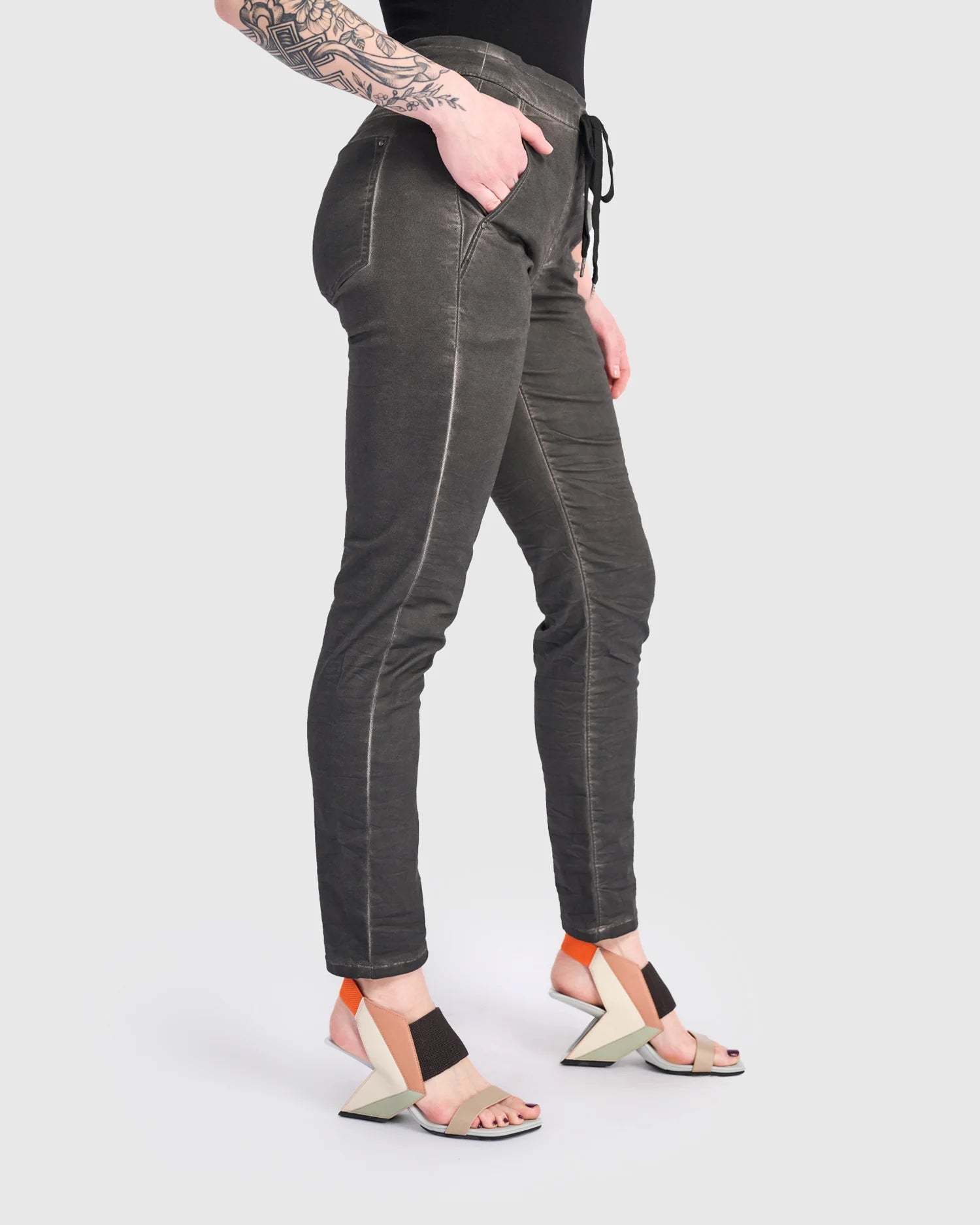 A lean silhouette that doesn't cling, these stretch jeans in soft Steel offer subtle polish with their coated finish and slim-straight leg. The flexible drawstring waist ensures a perfect fit, while the patch pockets and mock fly keep the design fuss-free and functional.