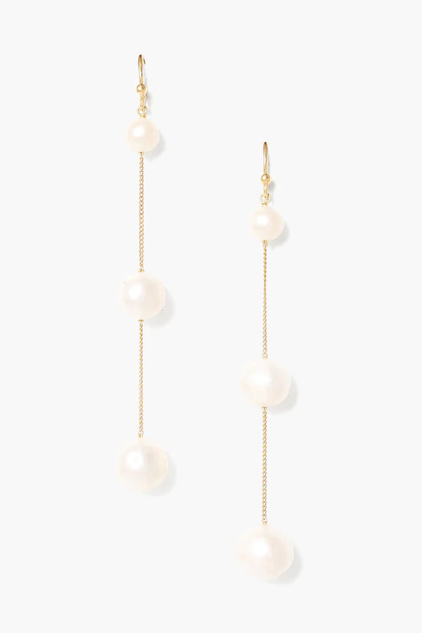 A uniquely striking earring featuring three cascading white freshwater pearls set on a delicate gold chain.